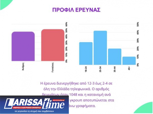 Η έρευνα διενεργήθηκε απο 12 Μαρτίου έως 2 Απριλίου σε όλη την Ελλάδα τηλεφωνικά και ο αριθμός δειγμάτων ήταν 1.048. Η καταναομή ανα φύλο και ηλικιακό γκρουπ αποτυπώνεται στο γράφημα και δείχνει την απήχηση που έχει η συγκατοίκηση ιδιαίτερα , περισσότερο στις γυναίκες απ΄ότι στους άνδρες και στις ηλικιακές ομάδες 18-24 και 25-34 .