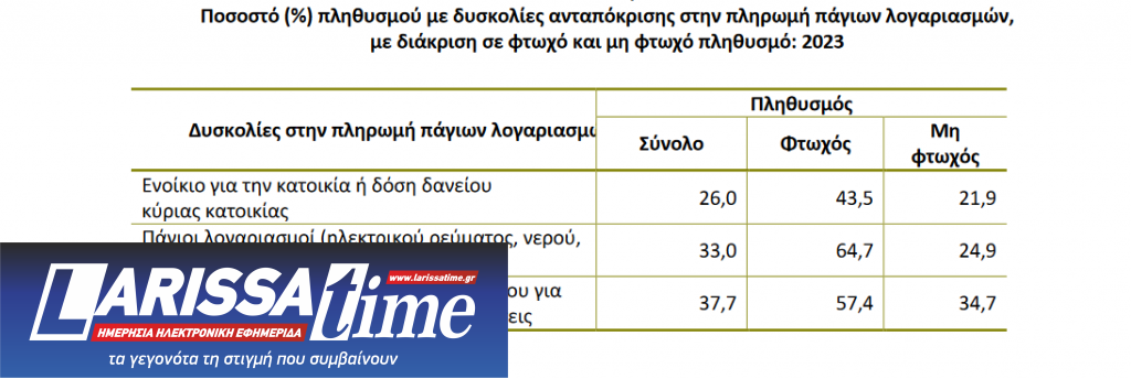 Πλέον στο σύνολο του πληθυσμού (φτωχοί και μη φτωχοί) σχεδόν ένα στα δύο νοικοκυριά (ποσοστό 47,3%) δυσκολεύεται να πληρώσει το νοίκι, τη δόση δανείου και τους λογαριασμούς, ενώ το 2022 το αντίστοιχο ποσοστό ήταν 29,1%.