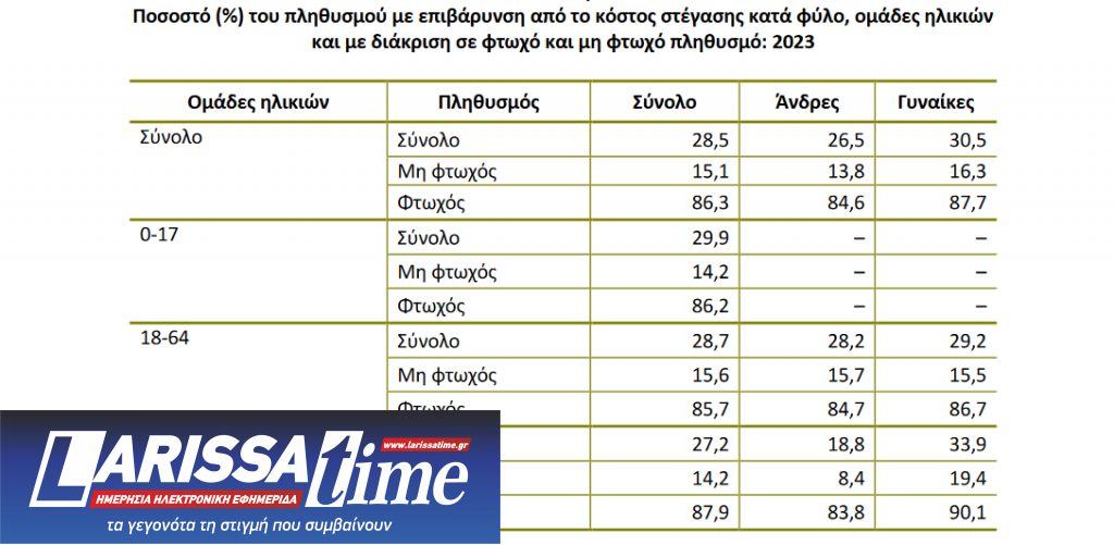 Ας σημειωθεί ότι το μεγαλύτερο πρόβλημα από την επιβάρυνση του κόστους στέγασης έχουν οι ηλικιωμένες γυναίκες (+65 ετών) στον φτωχό πληθυσμό, αφού το δηλώνουν σε ποσοστό 90,1%.