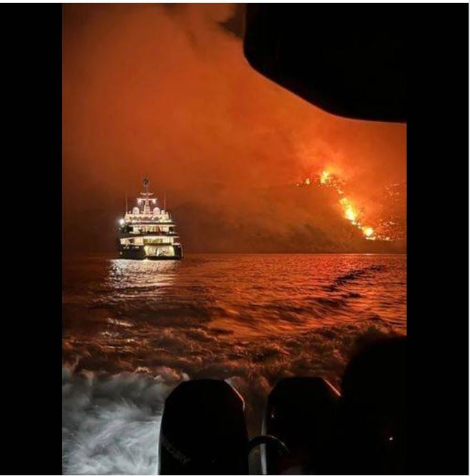 Σύμφωνα με όσα έχουν γίνει γνωστά μέχρι στιγμής, η πύρινη εστία προκλήθηκε από σκάφος που πετούσε πυροτεχνήματα, περίπου στις 22:40 και καίει το μοναδικό πευκοδάσος του νησιού, σε δύσβατο σημείο, που δεν έχει δρόμο.