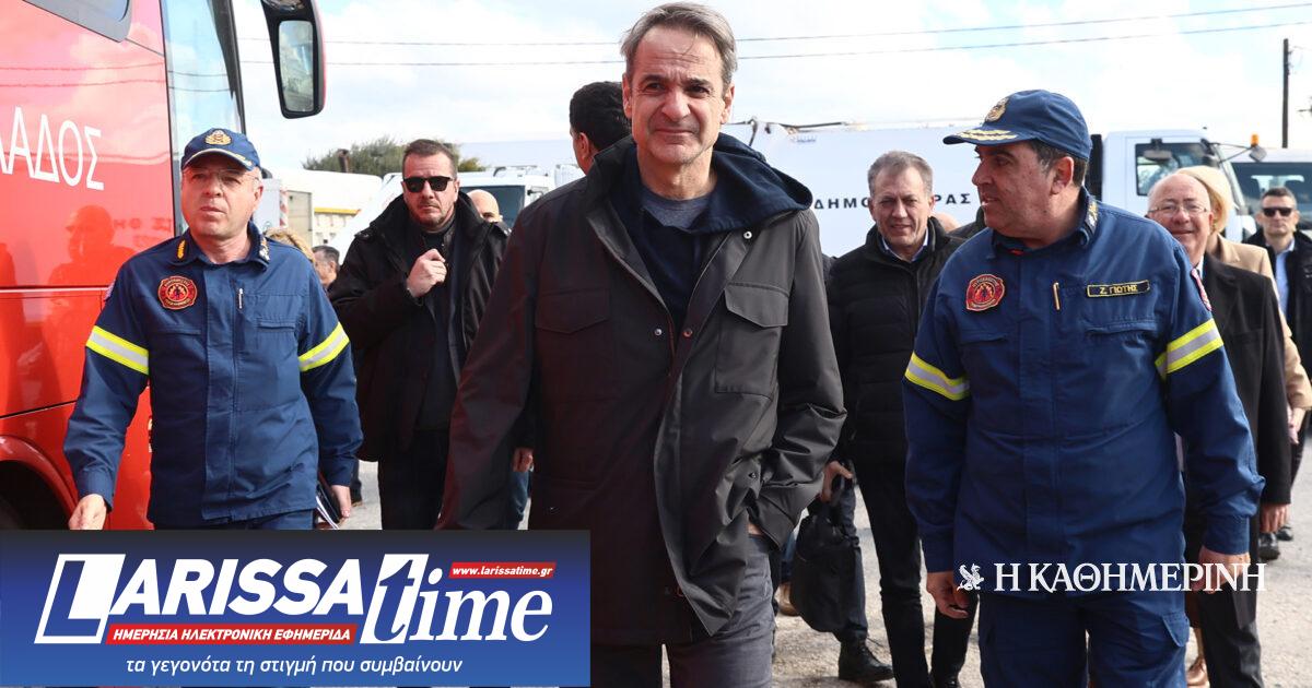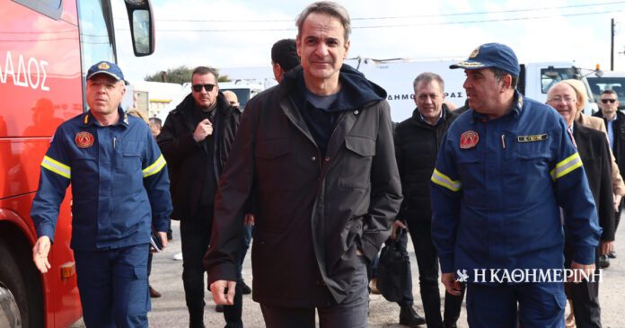 Τον Κυριάκο Μητσοτάκη συνοδεύει ο υπουργός Πολιτικής Προστασίας, Βασίλης Κικίλιας.