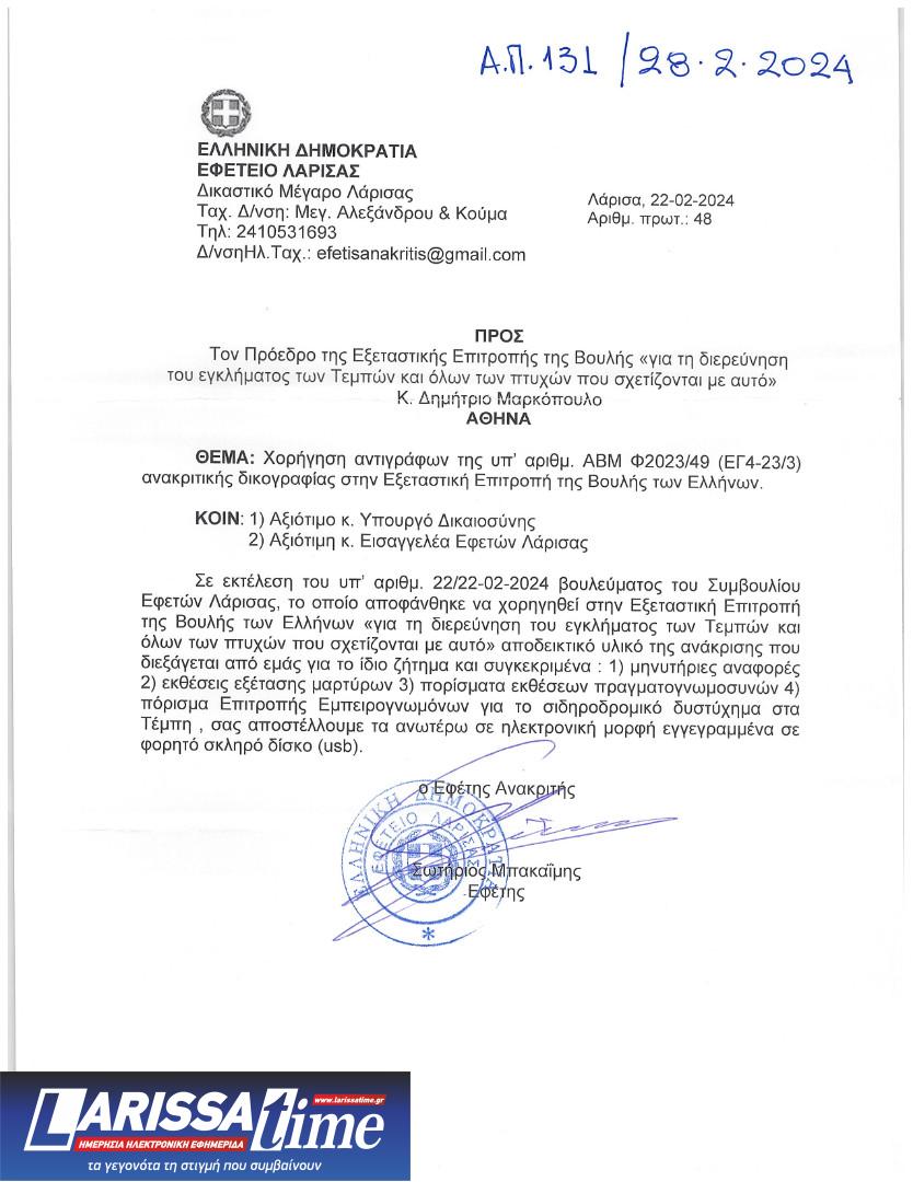 Θα ήθελα να σας ενημερώσω ότι σήμερα, 28 Φεβρουαρίου 2024, η Γραμματεία της Επιτροπής παρέλαβε το υπ’αριθμ. πρωτ. 48/22.02.2024 έγγραφο του Εφέτη Ανακριτή Λάρισας, με το οποίο διαβιβάσθηκαν σε ψηφιακή μορφή: 1) μηνυτήριες αναφορές, 2) εκθέσεις εξέτασης μαρτύρων, 3) πορίσματα εκθέσεων πραγματογνωμοσυνών, 4) πόρισμα Επιτροπής Εμπειρογνωμόνων για το σιδηροδρομικό δυστύχημα στα Τέμπη, και πρωτοκολλήθηκε (αρ. πρωτ. 131/28.02.2024) ως εισερχόμενο έγγραφο της Εξεταστικής Επιτροπής.