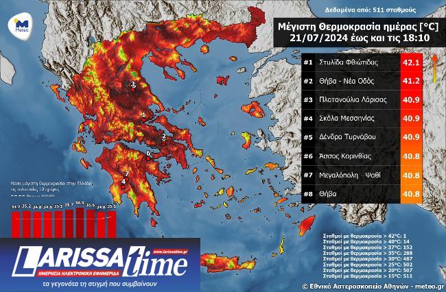 Η μέγιστη θερμοκρασία την Κυριακή 21/07 καταγράφηκε στη Στυλίδα Φθιώτιδας (42.1 °C) και ακολούθησε η Θήβα – Νέα Οδός (41.2 °C), τα Πλατανούλια Λάρισας, η Σκάλα Μεσσηνίας και τα Δένδρα Τυρνάβου (40.9 °C).