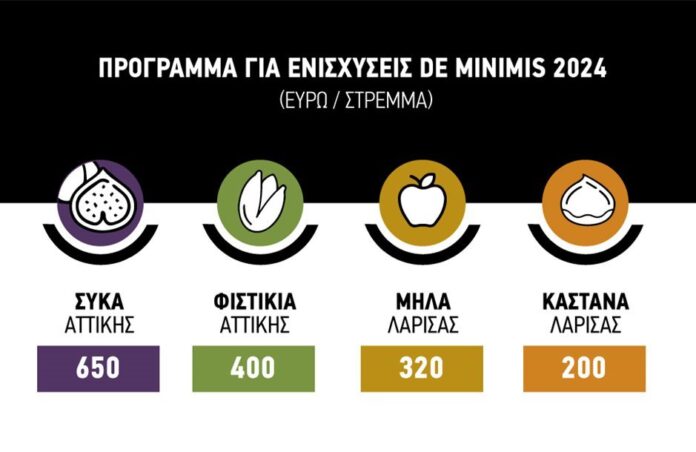 Δημοσιεύθηκε σε ΦΕΚ η Κοινή Υπουργική Απόφαση για το πακέτο de minimis, ύψους 11.165.000 ευρώ σε παραγωγούς νωπών σύκων, φιστικιών, της Π.Ε. Ανατολικής Αττικής καθώς και μήλων και κάστανων της Π.Ε. Λάρισας, που επλήγησαν από τη θεομηνία Daniel, ασθένειες και ακραία καιρικά φαινόμενα, κατά την περίοδο από 1 Ιανουαρίου έως και 31 Αυγούστου 2024.