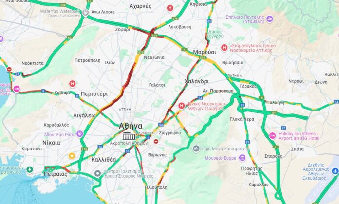 Στο «κόκκινο» βρίσκεται ο Κηφισός, αλλά και η Λεωφόρος Κηφισίας τμηματικά. Προβλήματα καταγράφοντας στην Κατεχάκη, στο ρεύμα από Ηλιούπολη αλλά και στους δρόμους γύρω από το λιμάνι του Πειραιά.