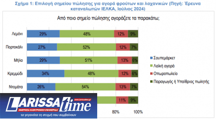 Καταρχάς, όπως φαίνεται στο σχήμα 1, σύμφωνα με τα αποτελέσματα έρευνας καταναλωτών του ΙΕΛΚΑ του Ιουλίου 2024, το κύριο κανάλι πώλησης για φρούτα και λαχανικά είναι η λαϊκή αγορά. Αν και υπάρχουν διαφοροποιήσεις ανάμεσα στα προϊόντα, το μεγαλύτερο μέρος των πωλήσεων φαίνεται ότι πραγματοποιείται από τις λαϊκές αγορές σε ποσοστό περί το 50%. Περίπου το 30% πραγματοποιείται από τις αλυσίδες σουπερμάρκετ, 12% από οπωροπωλεία και 8% απευθείας από τον παραγωγό. Μεγαλύτερα ποσοστά της τάξης του 34% φτάνει το κανάλι του σουπερμάρκετ στις αγορές πατάτας και κρεμμυδιού, ενώ υψηλότερα ποσοστά επιτυγχάνει η λαϊκή αγορά σε ντομάτα 54%, πορτοκάλι 52% και μήλο 51%.