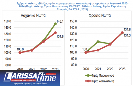 Όσον αφορά την πορεία των τιμών, όπως φαίνεται στο σχήμα 4, σύμφωνα με τα στοιχεία της ΕΛ.ΣΤΑΤ. των ερευνών δείκτη εκροών παραγωγού και του δείκτη τιμών καταναλωτή, τα τελευταία 4 χρόνια ακολουθούν αντίστοιχη πορεία. Συγκεκριμένα, οι τιμές των λαχανικών του παραγωγού έχουν αυξηθεί 46,1% ενώ του καταναλωτή 31,8% και οι τιμές για τα φρούτα του παραγωγού 31,8% και του καταναλωτή 31,3%.