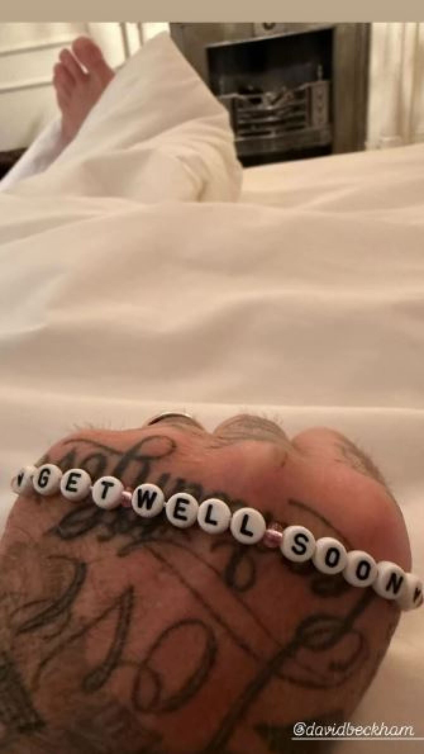 Η 51χρονη σχεδιάστρια μόδας δημοσίευσε μια φωτογραφία του 50χρονου πρώην άσου του ποδοσφαίρου να ποζάρει χαμογελαστός στο κρεβάτι του νοσοκομείου, φορώντας νάρθηκα στο δεξί του χέρι. Πάνω στη φωτογραφία, η σύζυγός του έγραψε «Περαστικά, μπαμπά», ενώ σε δεύτερη φωτογραφία εμφανίζεται ένα βραχιολάκι που του έδωσαν τα παιδιά του, με το ίδιο μήνυμα.