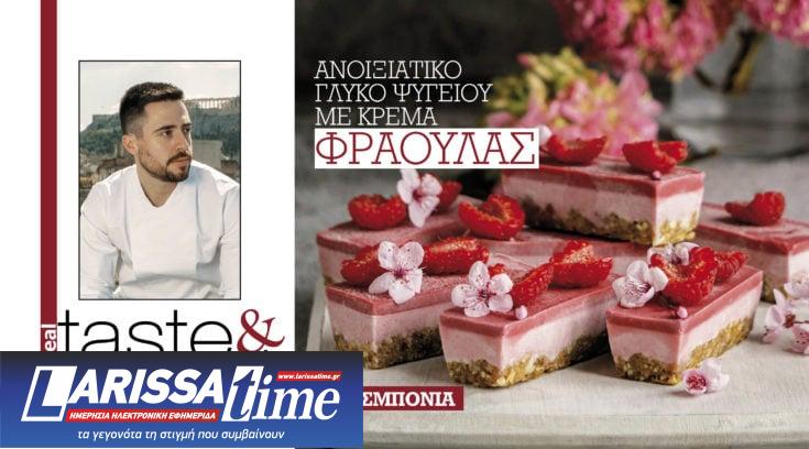 O pastry chef Στέφανος Σμπόνιας δημιουργεί ένα ανοιξιάτικο γλυκό ψυγείου με τραγανή βάση δημητριακών, κρέμα φράουλας και τζελ φραμπουάζ.