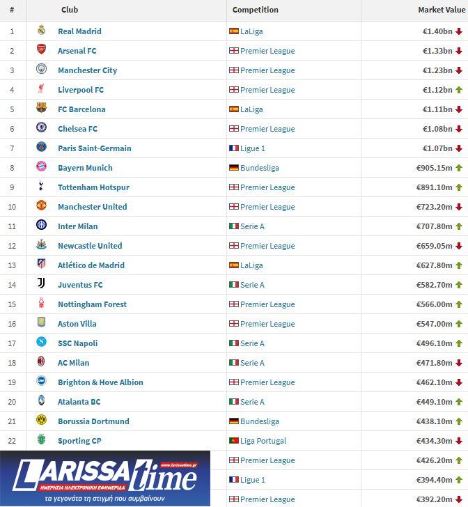 Πιο ακριβή ομάδα στον κόσμο είναι η Ρεάλ Μαδρίτης, με εκτιμώμενη αξία 1,4 δισεκατομμύρια ευρώ, μπροστά από την -2η- Άρσεναλ (1,33 δισεκατομμύρια ευρώ), ενώ το βάθρο ολοκληρώνει η Μάντσεστερ Σίτι (1,23 δισεκατομμύρια ευρώ).