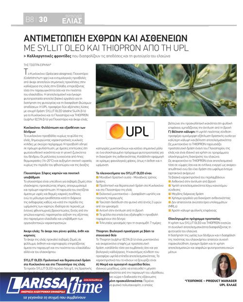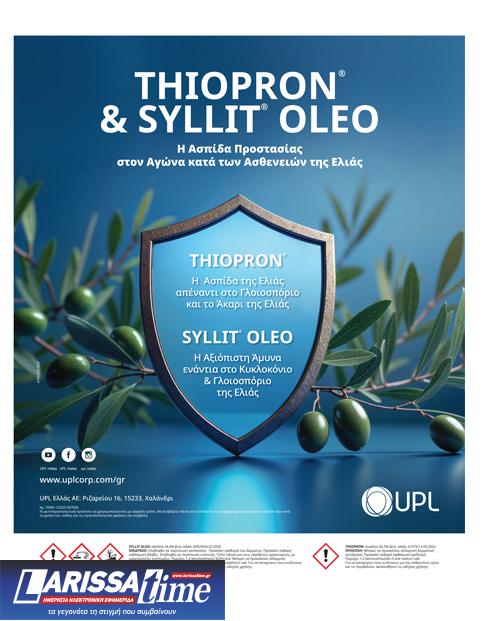 Η αποτελεσµατική και έγκαιρη φυτοπροστασία αποτελεί βασικό εργαλείο για τη διατήρηση της φυτοϋγείας και τη διασφάλιση βιώσιµων αποδόσεων. Η UPL προσφέρει δύο αξιόπιστες λύσεις µε ισχυρή δράση: SYLLIT OLEO (dodine 54,4% β/ο) για το Κυκλοκόνιο και το Γλοιοσπόριο και THIOPRON (sulphur 82,5% β/ο) για Γλοιοσπόριο και άκαρι ελιάς.
