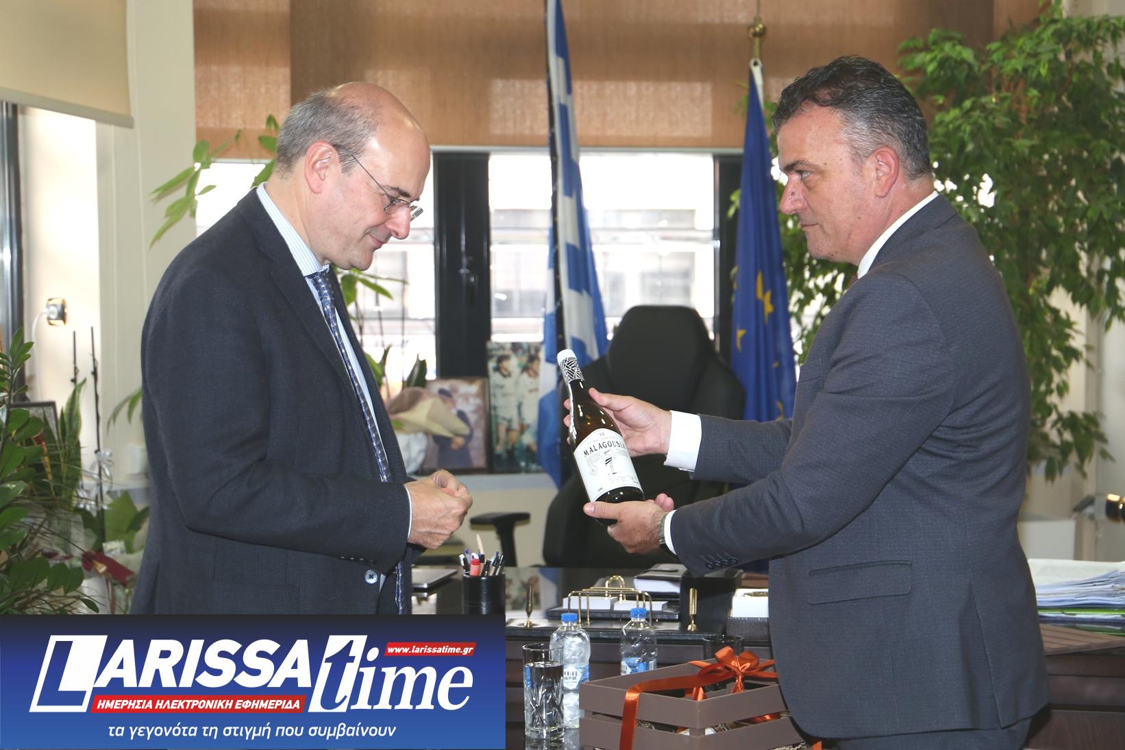 Το νόμισμα της πόλης, καθώς και καλάθι με τοπικά προϊόντα αγροδιατροφής (τσίπουρο Κατσάρου, κρασί Καριπίδη, χαλβάς-ταχίνι «Όλυμπος»-Παπαγιάννη και μαρμελάδες Jam&Jelly-Foodsurfing) ήταν τα εθιμοτυπικά δώρα του Δημάρχου Λαρισαίων προς τον κ.Χατζηδάκη.