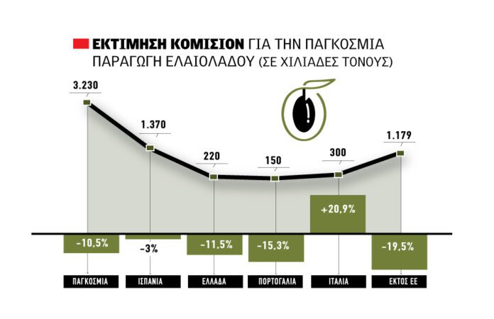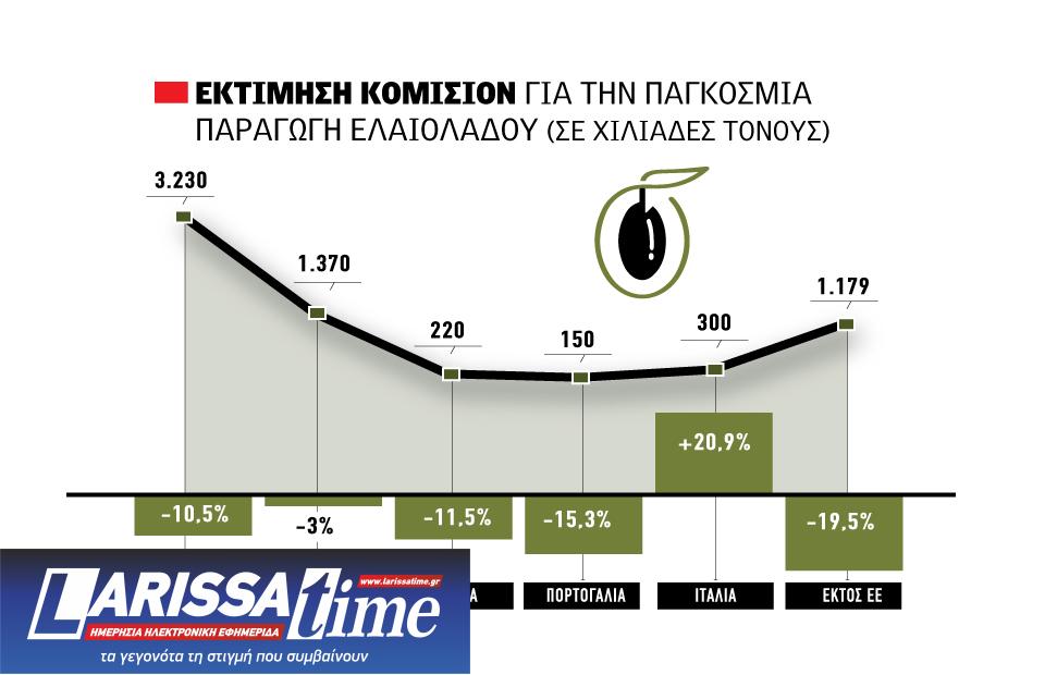 Τελευταία, η Κοµισιόν έδωσε τις δικές της εκτιµήσεις για την παγκόσµια και περιφερειακή παραγωγή ελαιολάδου, προβλέποντας µία ελληνική σοδειά στους 220.000 τόνους, µία ισπανική στους 1,37 εκατ. τόνους και την ιταλική στους 300.000 τόνους. Το ενδιαφέρον εδώ είναι η εκτίµηση για παραγωγή Τυνησίας 270.000 τόνων, όταν οι ίδιοι οι Τυνήσιοι βγαίνουν και λένε ότι έχουν τα διπλά κιλά γύρω στους 500.000 (!) τόνους. Σε παγκόσµιο επίπεδο, η Κοµισιόν υποστηρίζει πως η παραγωγή θα παίξει στους 3,2 εκατ. τόνους, µειωµένη κατά 300.000 τόνους συγκριτικά µε πέρυσι.