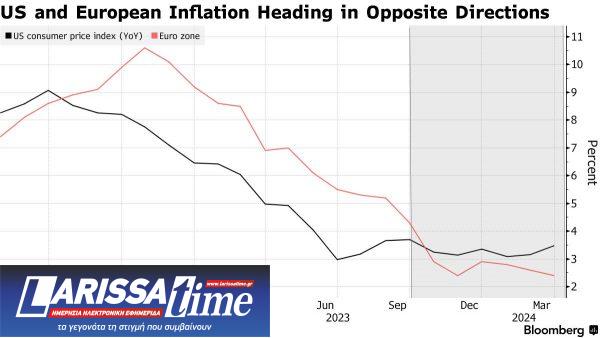Οι αγορές εκτιμούν τώρα ότι η ευρωζώνη, όπου τα πιο πρόσφατα στοιχεία για τις τιμές καταναλωτή υπολείπονται των εκτιμήσεων, θα γνωρίσει τρεις μειώσεις επιτοκίων το 2024, σε σύγκριση με λιγότερες από δύο για τη Fed.