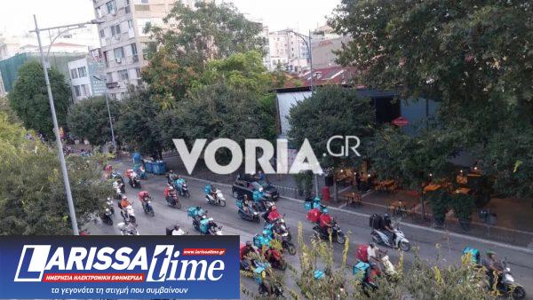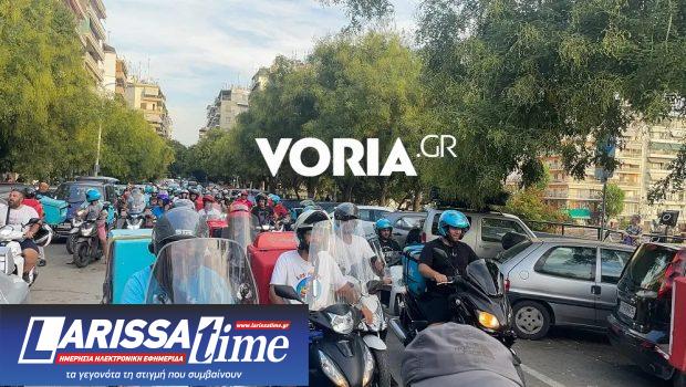 Μοτοπορεία με οικονομικά αιτήματα πραγματοποίησαν σε κεντρικούς δρόμους της Θεσσαλονίκης οι διανομείς της efood και wolt.