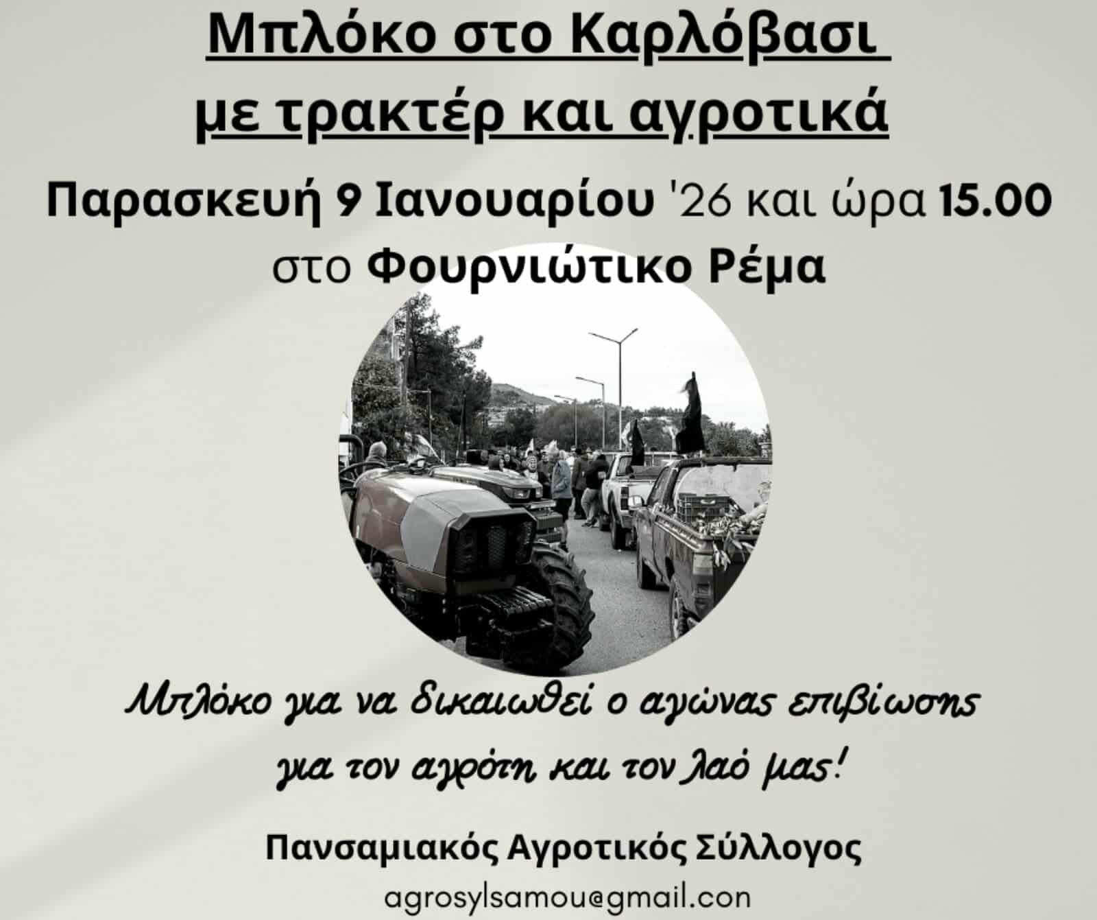 Σε νέα κινητοποίηση προχωρούν σήμερα οι αγρότες της Σάμου, που ετοιμάζονται να στήσουν μπλόκο στις 15:00 στο Φουρνιώτικο Ρέμα στο Καρλόβασι. Η απόφαση πάρθηκε στο πλαίσιο της συνέχισης του αγώνα που δίνουν οι παραγωγοί σε όλη τη χώρα, ζητώντας λύσεις στα προβλήματα που αντιμετωπίζουν.