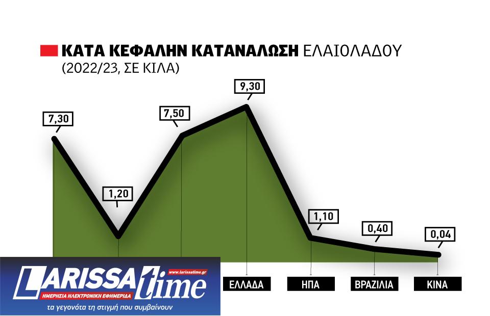 Σύμφωνα με τα νούμερα που δημοσίευσε το IOC και αφορούν προηγούμενη περίοδο, λίγο πριν τις πολύ υψηλές τιμές (2022/23), η κατά κεφαλήν κατανάλωση ελαιολάδου σε ορισμένες από τις μεγαλύτερες αγορές του κόσμου παραμένει πολύ κάτω από 2 κιλά ελαιολάδου το χρόνο. Η Ιαπωνία και η Βραζιλία καταγράφουν μόλις 0,4 κιλό ανά άτομο, ενώ οι Ηνωμένες Πολιτείες φτάνουν τα 1,1 κιλά και ο Καναδάς τα 1,2 κιλά. Ο συνδυασμένος πληθυσμός (ΗΠΑ, Βραζιλία, Καναδάς, Ιαπωνία) υπερβαίνει τα 710 εκατομμύρια άτομα και προσφέρεται για επιθετική επέκταση (αν δεν έχουμε δασμούς, ακόμα καλύτερα).