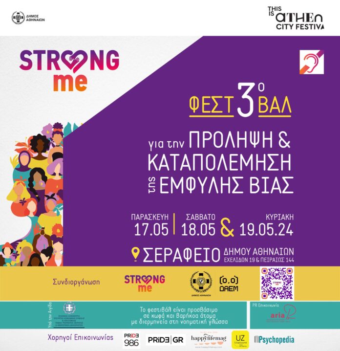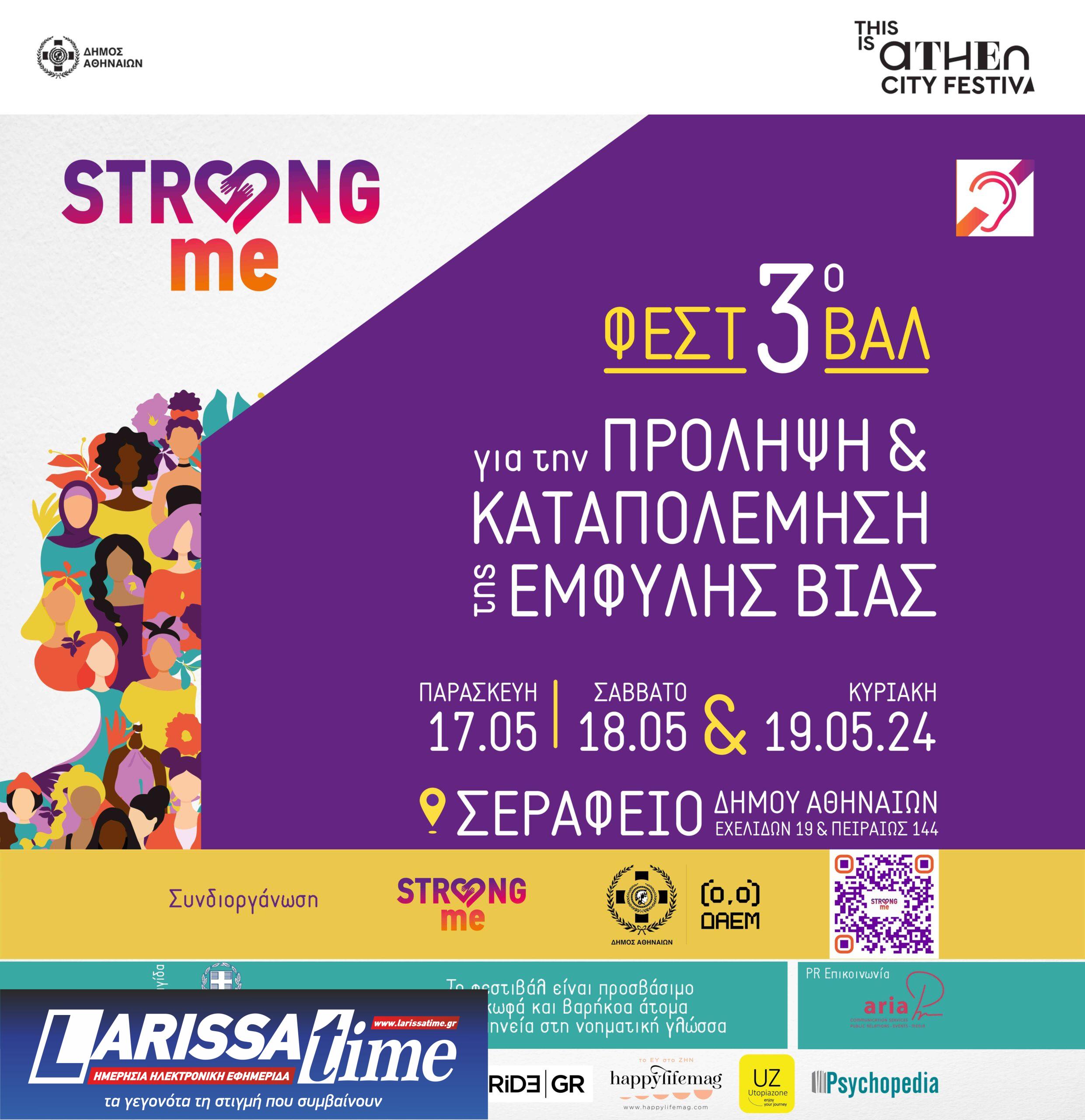 Το φεστιβάλ “Strong Me” έρχεται για 3η συνεχόμενη χρονιά πιο δυνατό από ποτέ! Ενώνουν τις δυνάμεις τους και την φωνή τους με 56 φορείς, οργανισμούς και συλλόγους από όλη την Ελλάδα. Γινόμαστε μια ομάδα με προσωπικότητες των επιστημών, των τεχνών, του αθλητισμού και του ακτιβισμού για την πρόληψη και την καταπολέμηση της έμφυλης βίας και με σκοπό να «ΚΑΝΟΥΜΕ ΤΟΝ ΦΟΒΟ ΜΑΣ ΔΥΝΑΜΗ».