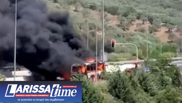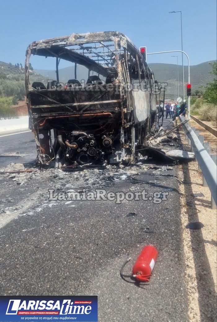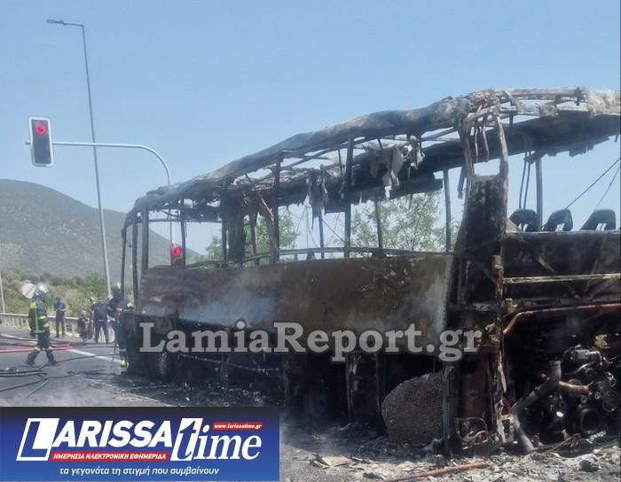 Σύμφωνα με το lamiareport το λεωφορείο τυλίχθηκε στις φλόγες στο ύψος της σήραγγας Στυλίδας στο ρεύμα προς Ράχες.