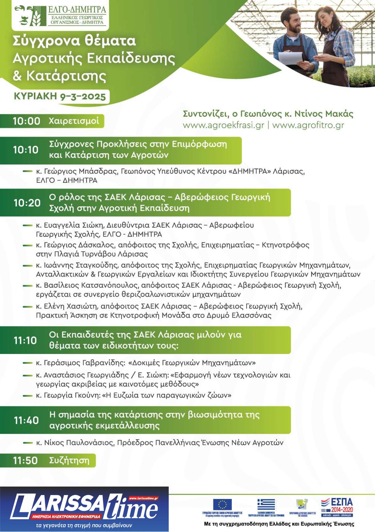Η εκδήλωση θα ξεκινήσει με χαιρετισμούς και συνεχιστεί με ενδιαφέροντα θέματα που αφορούν την επιμόρφωση των αγροτών, τη χρήση νέων τεχνολογιών και καινοτόμων μεθόδων στη γεωργία, καθώς και την εφαρμογή γεωργίας ακριβείας. Επίσης, θα αναδειχθούν οι σημαντικοί ρόλοι που διαδραματίζουν οι αγροτικές σχολές, όπως η ΣΑΕΚ Λάρισας, στην εκπαίδευση και την κατάρτιση νέων αγροτών και επαγγελματιών του γεωργικού τομέα.