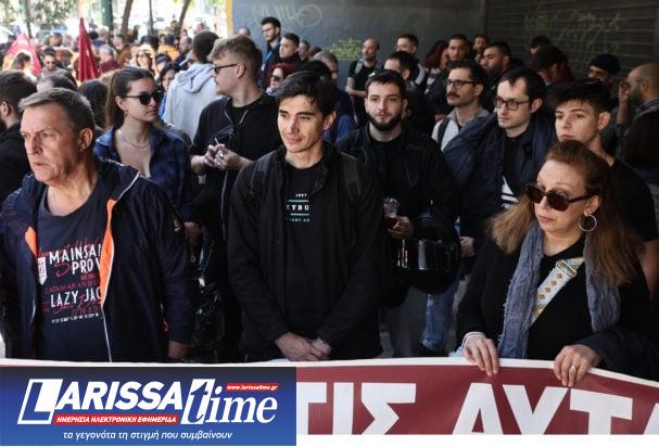 Οι εργαζόμενοι φωνάζουν συνθήματα και κρατούν σημαίες και πανό στα οποία αναγράφουν: «Διεκδικούμε κλαδικές συμβάσεις με αυξήσεις» και «Κάτω τα χέρια από το 5ήμερο- 8ωρο».