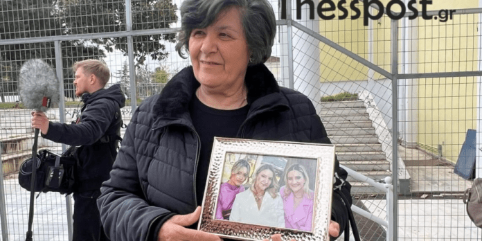 Η γιαγιά της Θώμης, της Χρύσας και της Αναστασίας, κρατώντας στα χέρια της μία κορνίζα με φωτογραφία των τριών εγγονιών της, δίνει το παρών στη δίκη, και ελπίζει να αποδοθεί δικαιοσύνη.