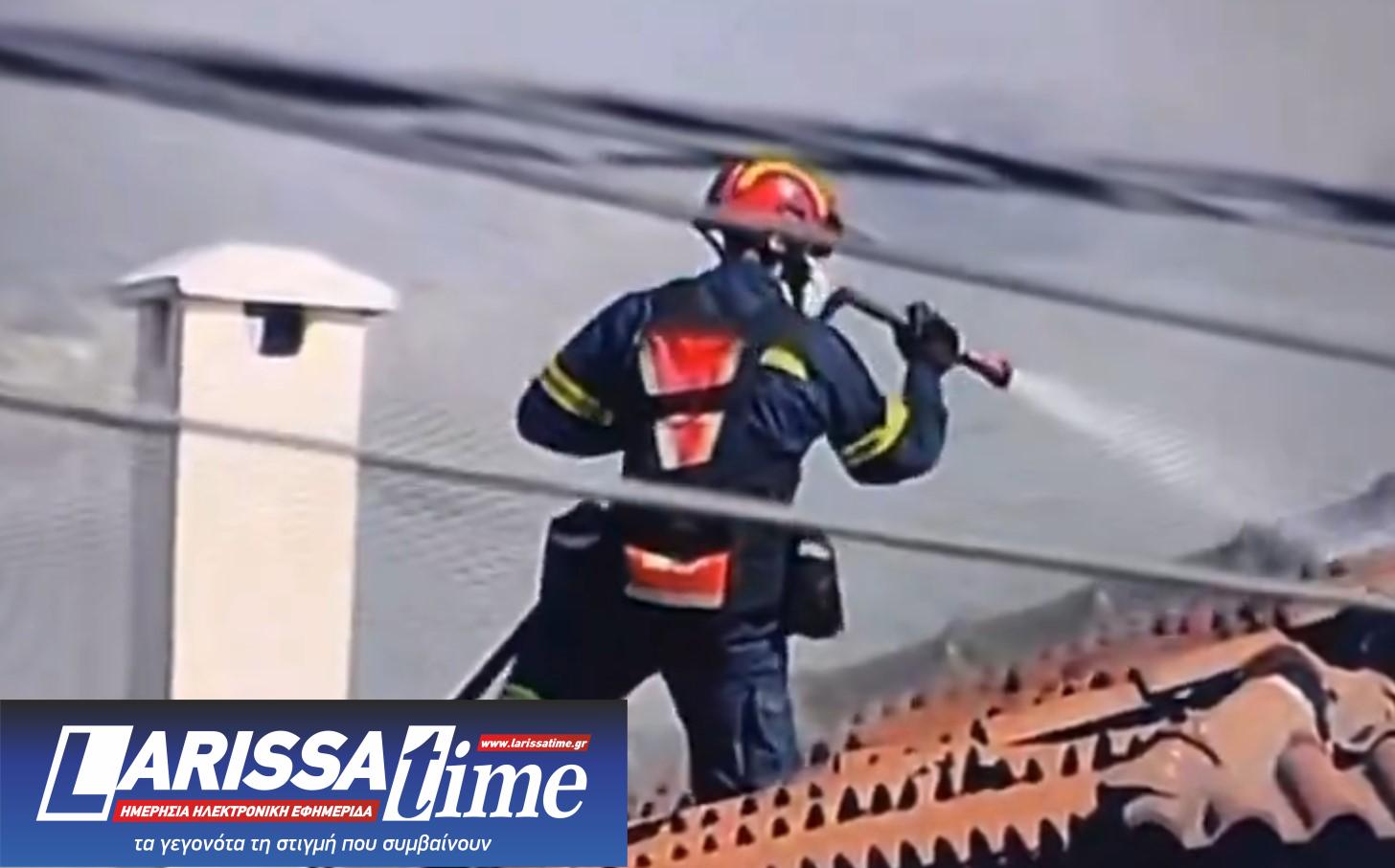 Συγκεκριμένα, στο βιντεοληπτικό υλικό που παρουσιάζει το Forecast Weather Greece, φαίνεται ο πυροσβέστης με πλήρη εξοπλισμό και φορώντας την μάσκα του να έχει ανέβει στην ετοιμόρροπη στέγη ενός σπιτιού και να ρίχνει νερό με τη μάνικα για να μην αφήσει τις φλόγες να επεκταθούν.
