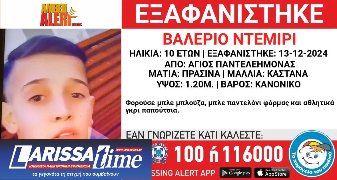 Συναγερμός εχει σημάνει στις Αρχές για την εξαφάνιση του 10χρονου Βαλέριο Ντεμίρι στην περιοχή του Αγίου Παντελεήμονα στην Αθήνα.
