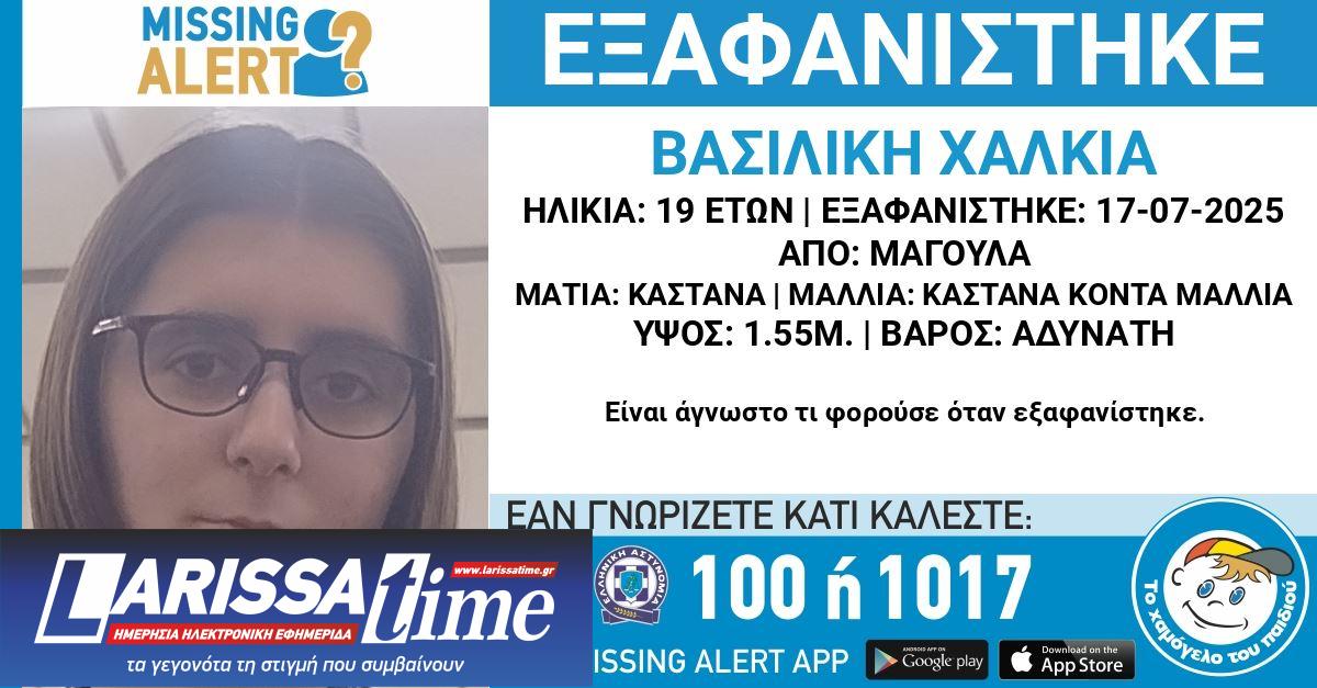 Στις 17/07/25, πρωινές ώρες εξαφανίστηκε από την περιοχή της Μαγούλας Αττικής, η Χαλκιά Βασιλική 19 ετών.