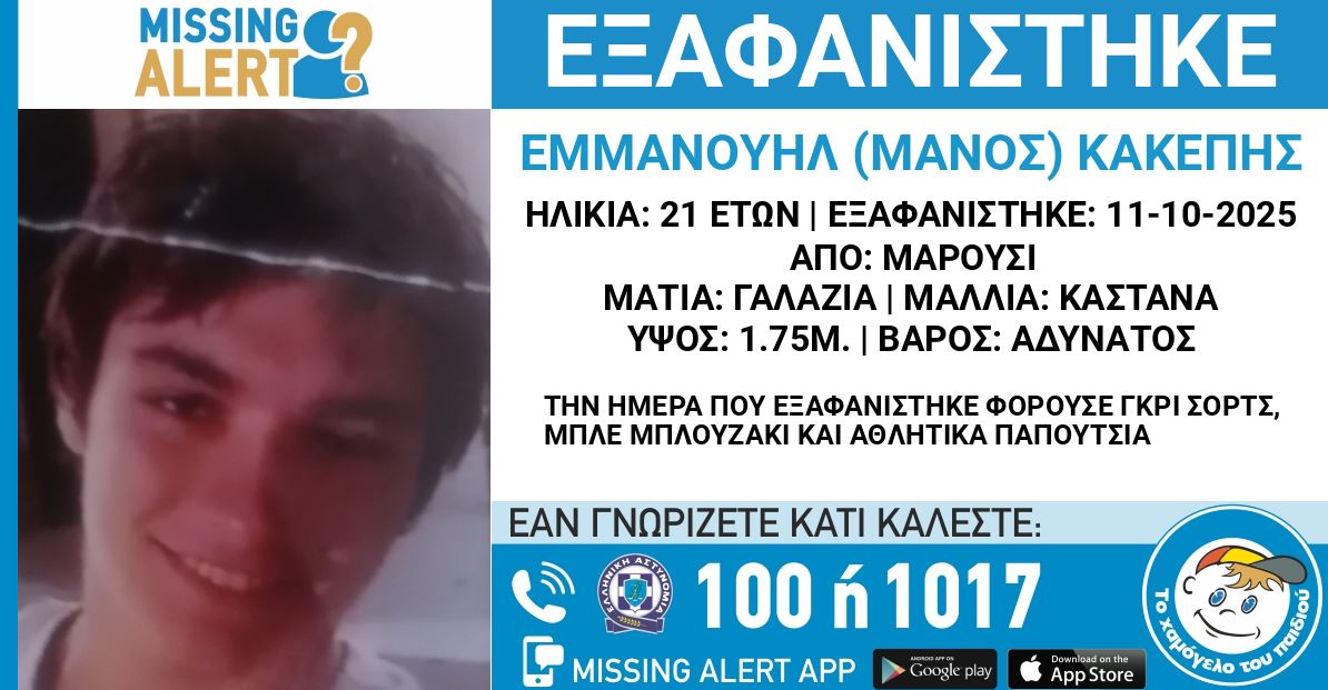 «Στις 11/10/2025, εξαφανίστηκε από την περιοχή του Αμαρουσίου, ο Εμμανουήλ (Μάνος) Κακέπης, 21 ετών. «Το Χαμόγελο του Παιδιού» ενημερώθηκε σήμερα,