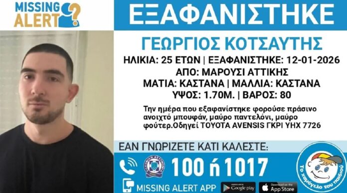 Συναγερμός έχει σημάνει στις αρχές για την εξαφάνιση του 25χρονου Γεωργίου Κοτσαύτη, τα ίχνη του οποίου χάθηκαν τη Δευτέρα (12/01) από το Μαρούσι.