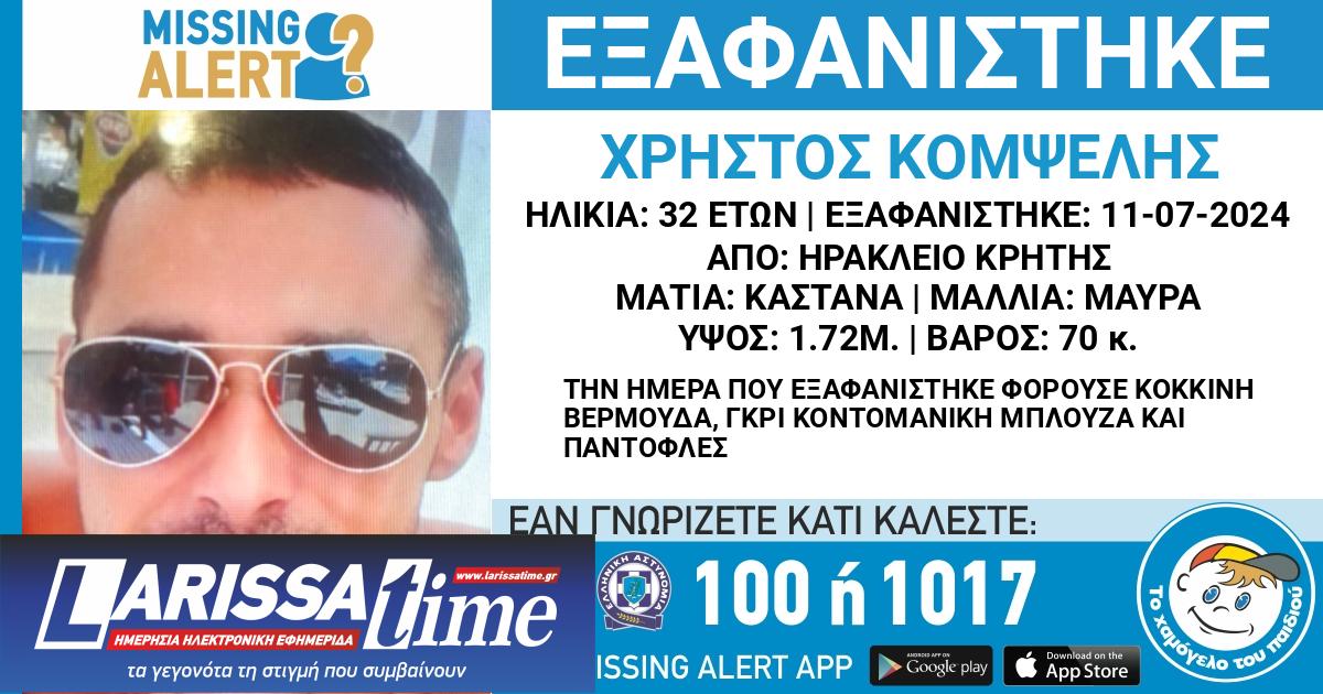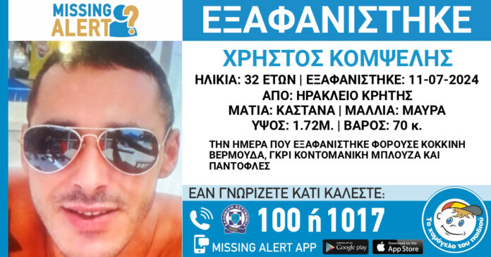 Συναγερμός έχει σημάνει στο Ηράκλειο της Κρήτης για την εξαφάνιση του 32χρονου Χρήστου Κομψέλη, από το σπίτι του το απόγευμα της 11ης Ιουλίου.