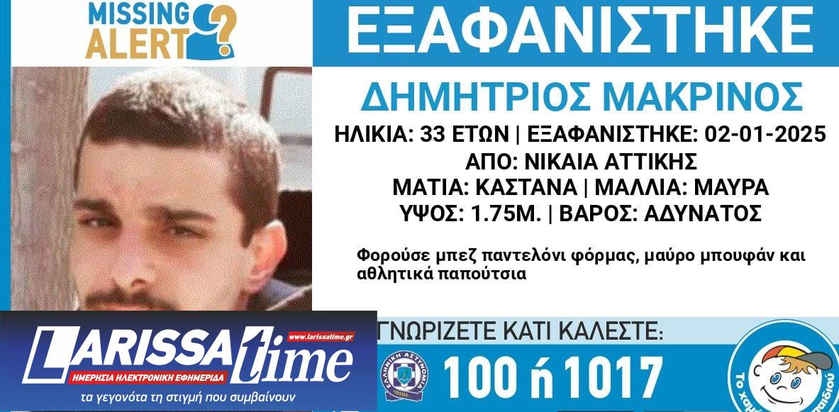 Συναγερμός έχει σημάνει για την εξαφάνιση του 33χρονου Δημήτρη Μακρινού που εξαφανίστηκε στην περιοχή της Νίκαιας την Πέμπτη (2/1).