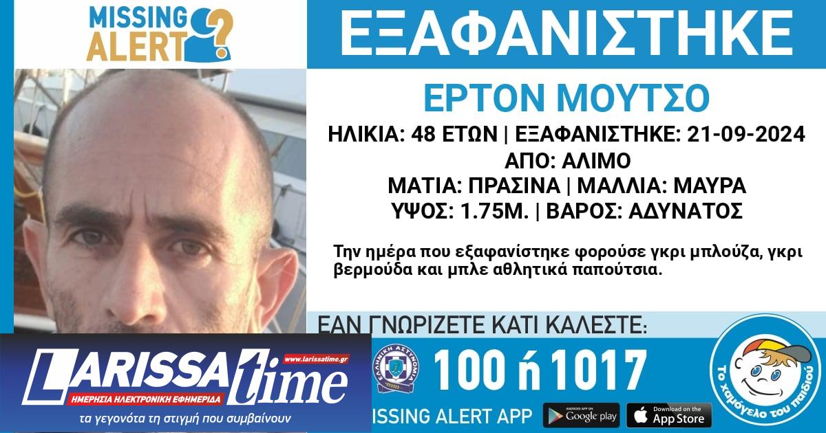 Συναγερμός έχει σημάνει στον Άλιμο για την εξαφάνιση του 48χρονου, αλβανικής καταγωγής, Έρτον Μούτσο στις 21 Σεπτεμβρίου.
