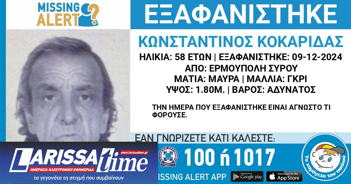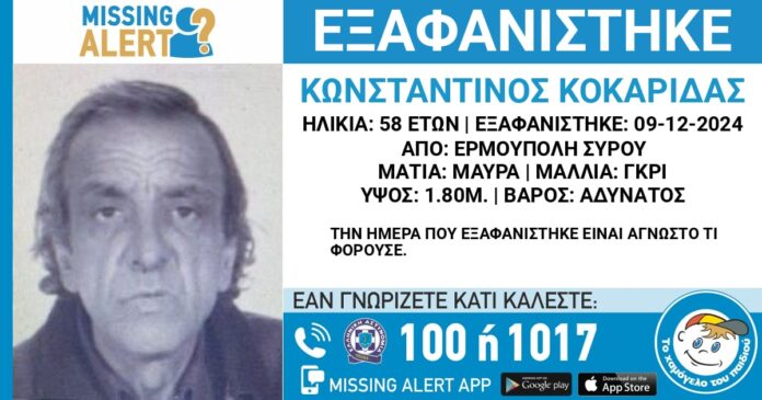 Συναγερμός έχει σημάνει στις Αρχές για την εξαφάνιση του 58χρονου Κωνσταντίνου Κοκαρίδα, από την Ερμούπολη της Σύρου.