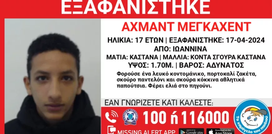 Συναγερμός έχει σημάνει στις Αρχές των Ιωαννίνων για την εξαφάνιση του νεαρού Αιγύπτιου Αχμάντ Μέγκαχετν από δομή φιλοξενίας, όπως αναφέρει το «Χαμόγελο του Παιδιού».