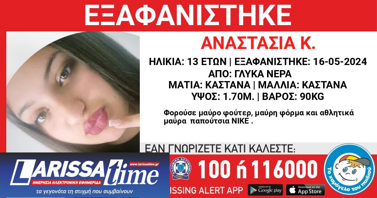 Συναγερμός σήμανε στις Αρχές για την εξαφάνιση της 13χρονης Αναστασίας Κ. από τα Γλυκά Νερά Αττικής.