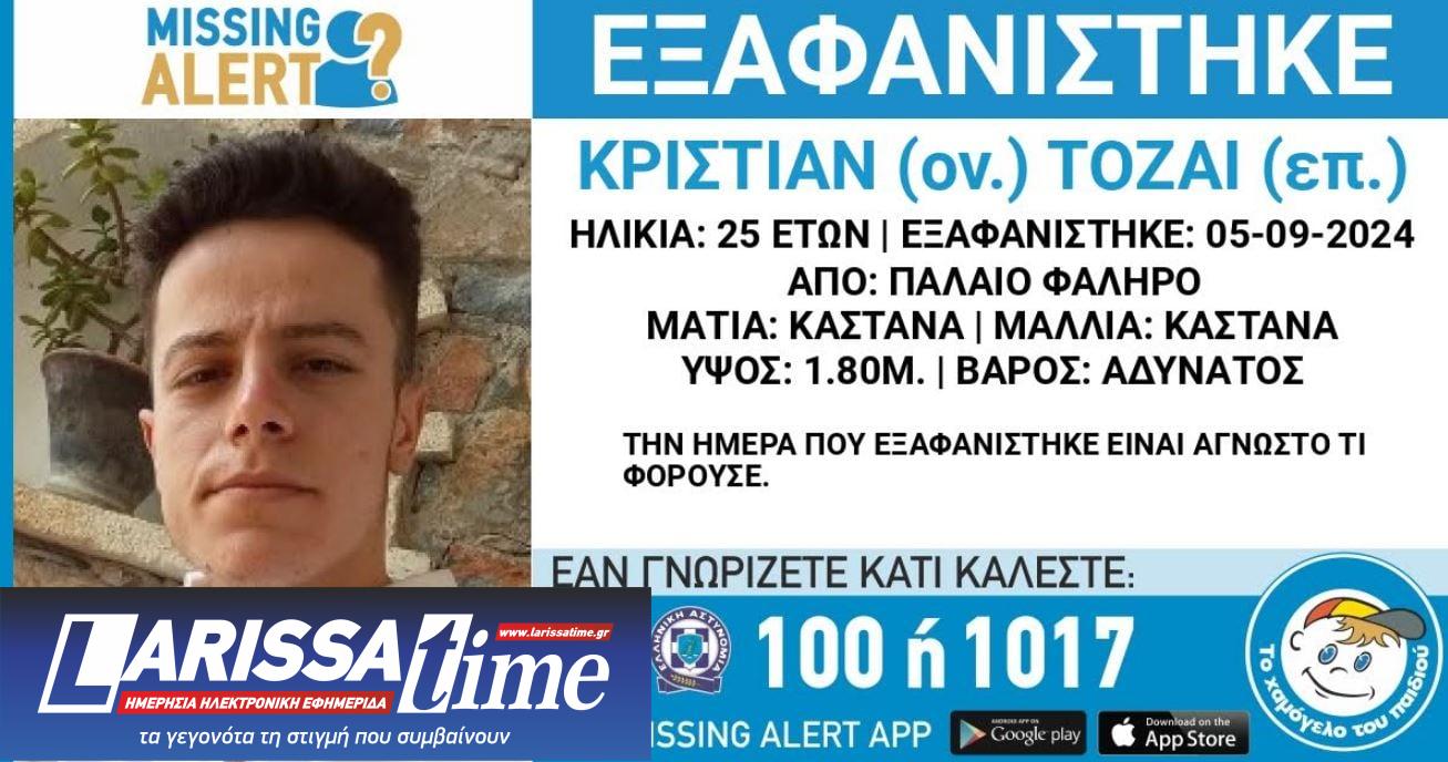 Συναγερμός σήμανε στις Αρχές για την εξαφάνιση 25χρονου από το Παλαιό Φάληρο Αττικής. Πρόκειται για τον Κριστιάν (ον.) Τοζάι (επ.), αλβανικής καταγωγής, τα ίχνη του οποίου χάθηκαν στις 05/09/2024.
