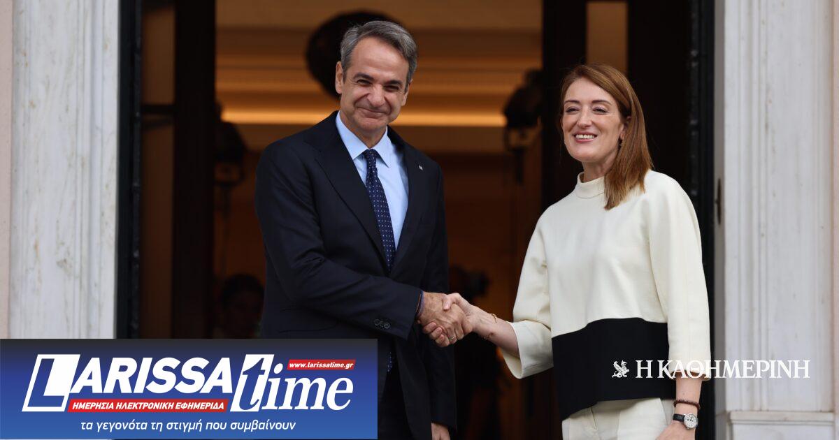 Την πρόεδρο του Ευρωπαϊκού Κοινοβουλίου, Ρομπέρτα Μέτσολα, υποδέχτηκε το μεσημέρι στο Μέγαρο Μαξίμου ο πρωθυπουργός, Κυριάκος Μητσοτάκης.