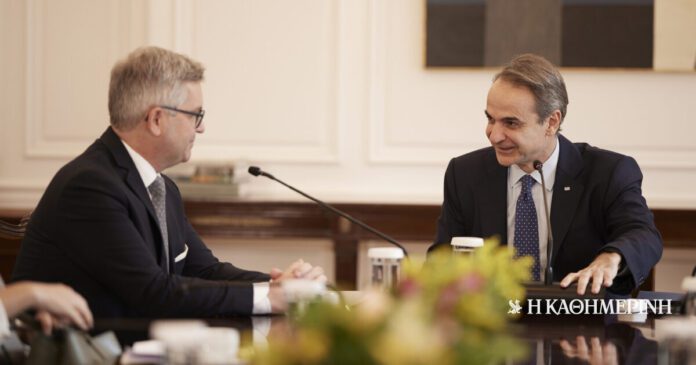 Με τον επίτροπο Εσωτερικών Υποθέσεων και Μετανάστευσης της Ευρωπαϊκής Eνωσης Μάγκνους Μπρίνερ (Magnus Brunner) συναντήθηκε στο Μέγαρο Μαξίμου, ο πρωθυπουργός Κυριάκος Μητσοτάκης.