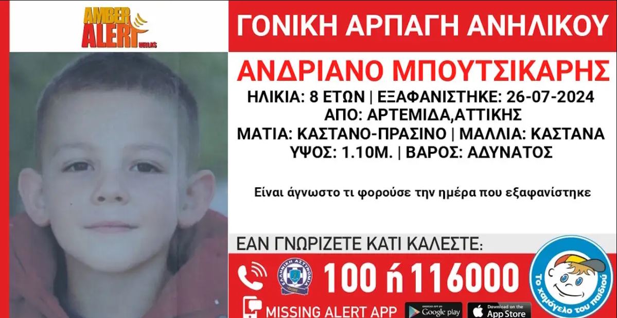 Ένας 8χρονος αγνοείται στην Αρτέμιδα Αττικής, με την αναζήτηση του μικρού παιδιού να συνεχίζεται, όπως αναφέρει το Χαμόγελο του Παιδιού, σε νέα ανακοίνωσή του.