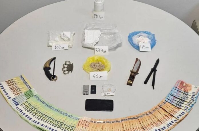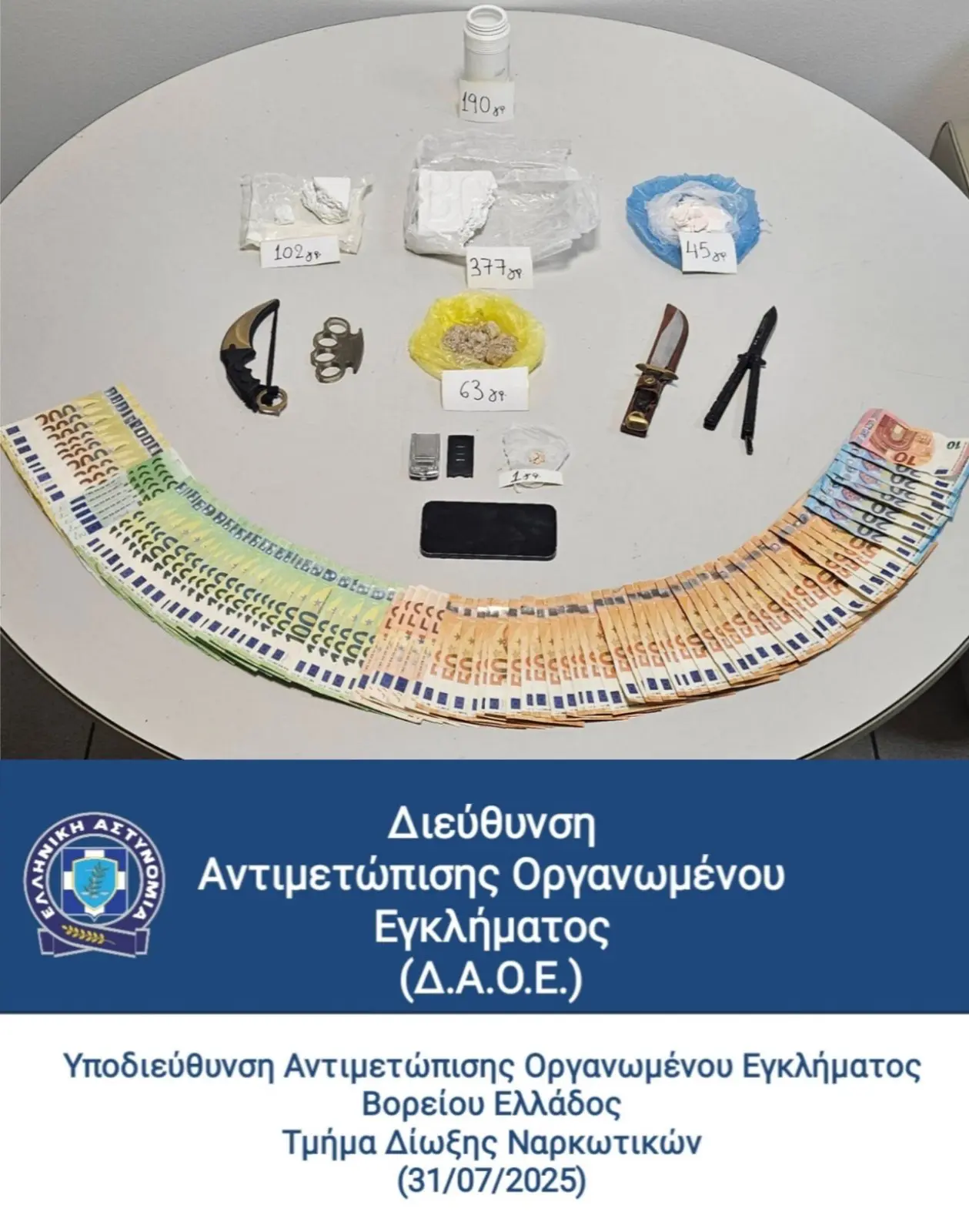Οι παραπάνω ναρκωτικές ουσίες κατασχέθηκαν, όπως επίσης μία σιδηρογροθιά και τρία μαχαίρια που κατείχε, μεταξύ αυτών ένα τύπου «karambit» κι ένα τύπου «πεταλούδα», ενώ ως μέσο διευκόλυνσης των παράνομων δραστηριοτήτων κατασχέθηκε η δίκυκλη μοτοσικλέτα του.