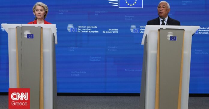 «Βρισκόμαστε σαφώς σε καλύτερη θέση απ’ ό,τι ήμασταν πριν από 24 ώρες», δήλωσε από την πλευρά της η Ούρσουλα φον ντερ Λάιεν, η πρόεδρος της Ευρωπαϊκής Επιτροπής, τονίζοντας πως «αντλήσαμε διδάγματα από τη συλλογική μας στρατηγική». Όπως επισήμανε, «υπήρξε αδιαμφισβήτητη αλληλεγγύη προς τη Γροιλανδία και τη Δανία» και «σταθήκαμε επίσης ακλόνητοι δίπλα στα έξι κράτη μέλη που απειλούνταν με δασμούς».