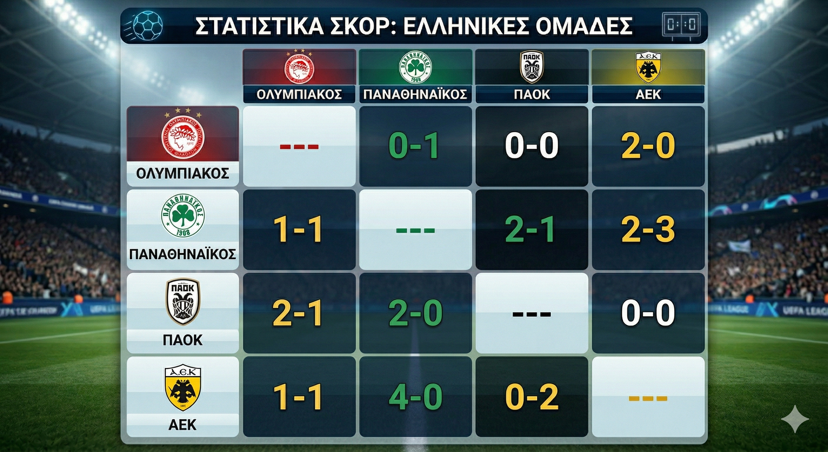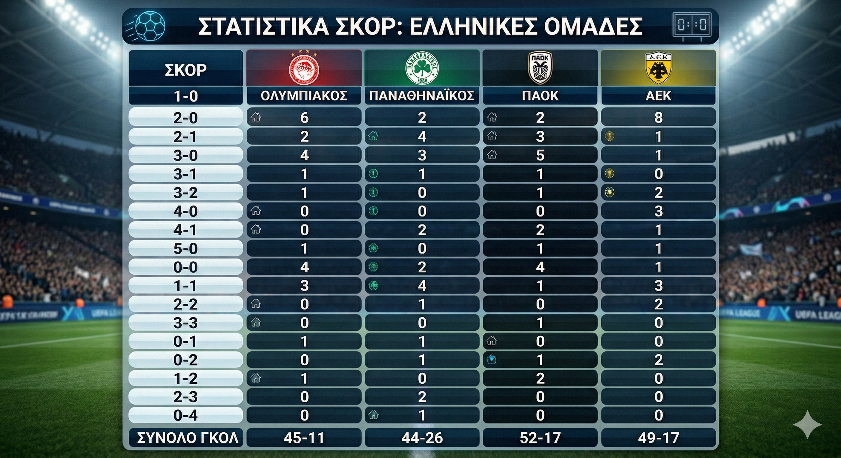 Το Αθηναϊκό-Μακεδονικό Πρακτορείο Ειδήσεων καταγράφει τα σκορ που έφεραν οι τέσσερις σύλλογοι στην κανονική διάρκεια του πρωταθλήματος. Αναμφισβήτητα, για την πρωτοπόρο ΑΕΚ το 1-0 είναι το αγαπημένο της, καθώς αυτό εμφανίστηκε σε οκτώ (8) από τις 18 νίκες της. Αντίστοιχα, το 2-0 ήταν αυτό που… φορέθηκε σε έξι (6) από τις 17 νίκες του Ολυμπιακού ενώ ο ΠΑΟΚ πήρε πέντε (5) «τρίποντα» με σκορ 3-0. Πιο «μοιρασμένα» τα αποτελέσματα του Παναθηναϊκού καθώς αφενός κατέκτησε τέσσερις νίκες με σκορ 2-1 ενώ άλλα τόσα παιχνίδια του (4) ολοκληρώθηκαν ισόπαλα με σκορ 1-1.