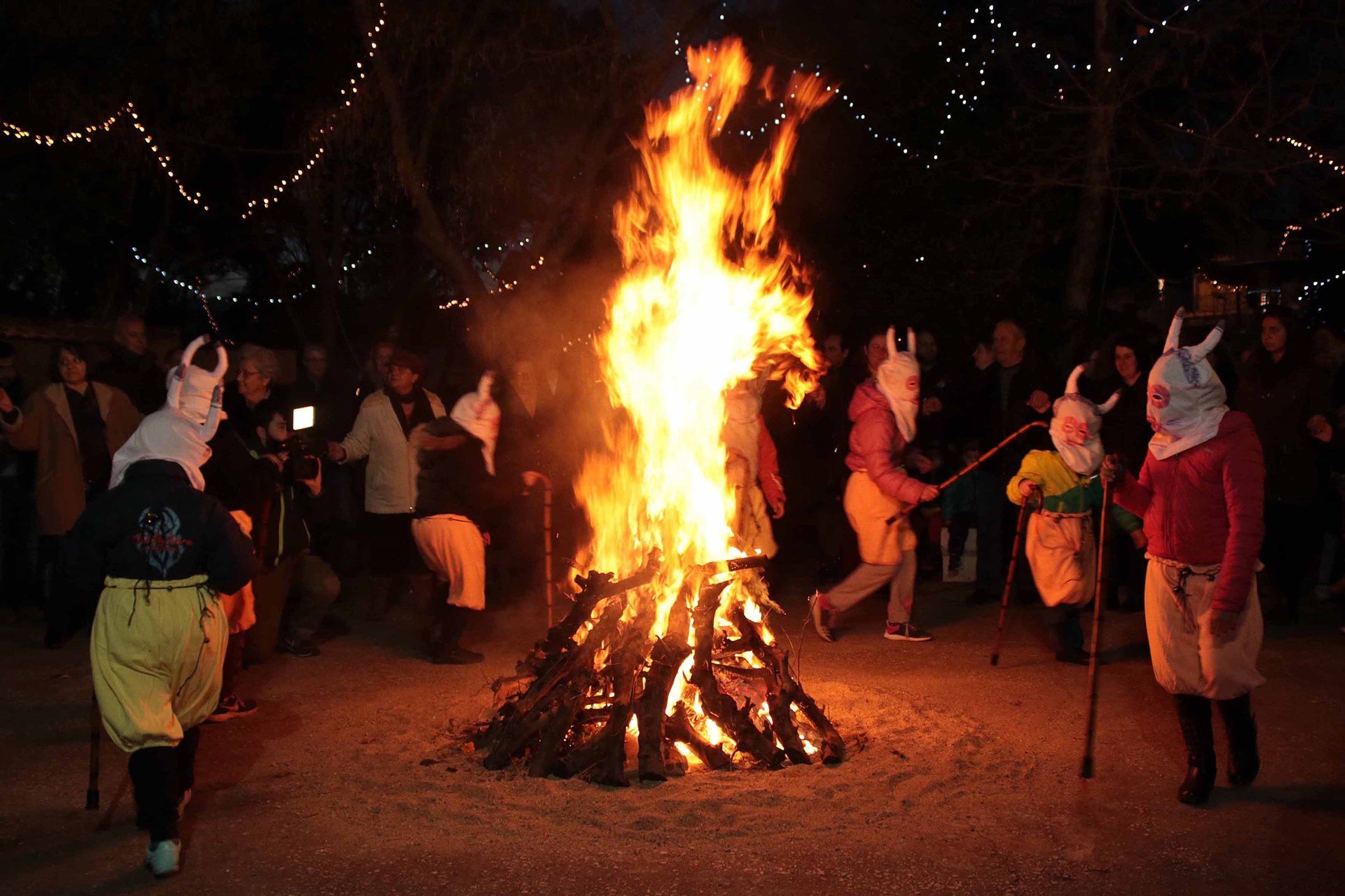 Οι φλόγες ανέβαιναν ψηλά και οι άνθρωποι τριγύριζαν την πυρά χορεύοντας και τραγουδώντας. Όλοι παρακολουθούσαν την κατεύθυνση του καπνού. Αν πήγαινε Ανατολικά, ήταν καλό σημάδι, η σοδειά θα ήταν πλούσια. Αν στρέφονταν προς τη Δύση, τον Βορρά ή τον Νότο, μόνον τα σπίτια του χωριού που ήταν σ’ εκείνα τα σημεία θα είχαν καλή συγκομιδή. Όταν χαμήλωνε η φωτιά, τα παιδιά πηδούσαν από πάνω τρεις φορές. Μερικοί έπαιρναν από τη φωτιά μισοκαμμένα ξύλα και τα πήγαιναν στο τζάκι του σπιτιού για γούρι. Άλλοι έπαιρναν κάρβουνα και τα φύλαγαν για να τα χρησιμοποιήσουν στο θυμιατήρι τους. Στο τέλος μάζευαν τη στάχτη και την σώρευαν πίσω από το ιερό της εκκλησίας.