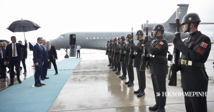 Ο Κυριάκος Μητσοτάκης έφτασε στην Αγκυρα στις 15.10 και τον υποδέχθηκε στο αεροδρόμιο ο υπουργός Εξωτερικών της Τουρκίας Χακάν Φιντάν με μια εγκάρδια χειραψία. Ο Ελληνας πρωθυπουργός έφτασε στο προεδρικό μέγαρο της Τουρκίας περίπου στις 4 μ.μ., με τον κ. Ερντογάν να τον υποδέχεται στα σκαλοπάτια της εισόδου. Ο πρόεδρος της Τουρκίας είπε στον κ. Μητσοτάκη «καλώς ήρθατε», και ο κ. Μητσοτάκης εξέφρασε τη χαρά του που βρίσκεται στην τουρκική πρωτεύουσα.