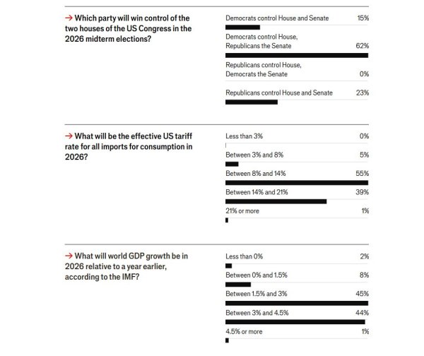 Ακριβώς μοιρασμένες στη μέση είναι οι προβλέψεις για το παγκόσμιο ΑΕΠ το 2026. Οι προγνώστες δίνουν 45% πιθανότητες να αυξηθεί από 1,5% ως 3% και 44% να αυξηθεί από 3% ως 4,5%