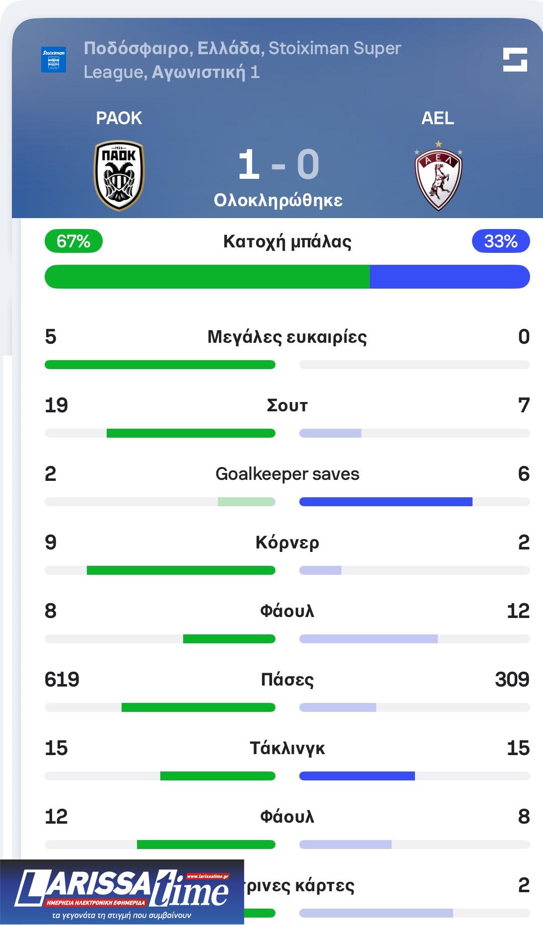 Τα στατιστικά του αγώνα ΠΑΟΚ-ΑΕΛ 1-0