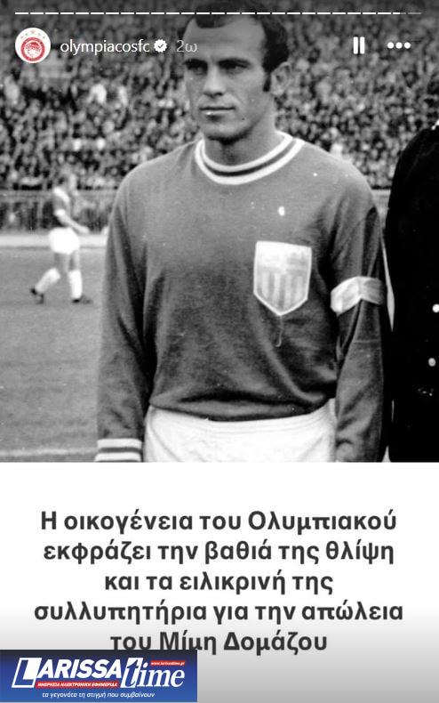 «Η οικογένεια του Ολυμπιακού εκφράζει την βαθιά της θλίψη και τα ειλικρινή της συλλυπητήρια για την απώλεια του Μίμη Δομάζου», έγραψαν οι ερυθρόλευκοι σε Story στο Instagram.
