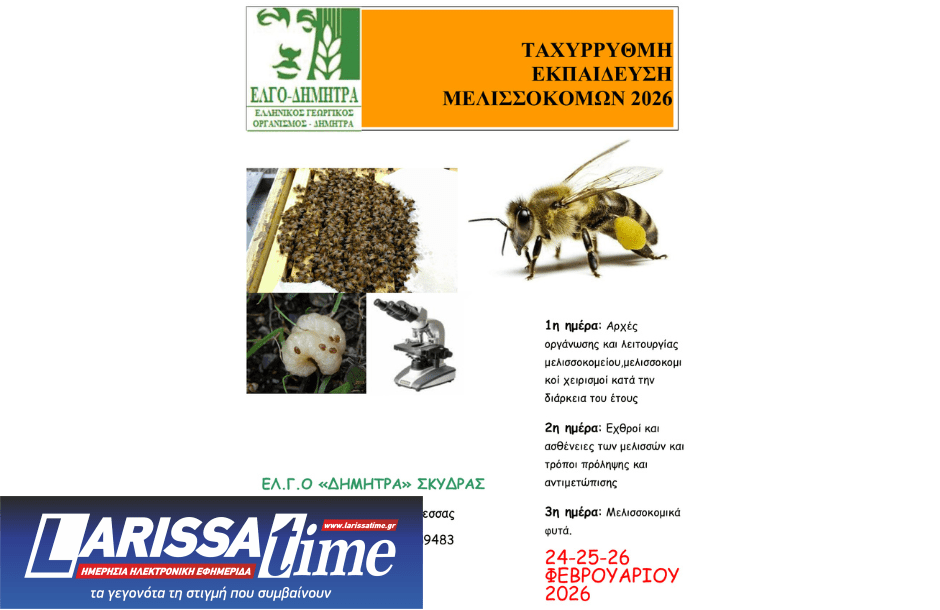 Ο ΕΛΓΟ – ΔΗΜΗΤΡΑ Σκύδρας πρόκειται να ξεκινήσει την υλοποίηση ενός ταχύρρυθμου προγράμματος που απευθύνεται σε Μελισσοκόμους της Π.Ε.Πέλλας. Η κατάρτιση των μελισσοκόμων θα ξεκινήσει στις 24-02-2026 ημέρα Τρίτη και ώρα 15:00.